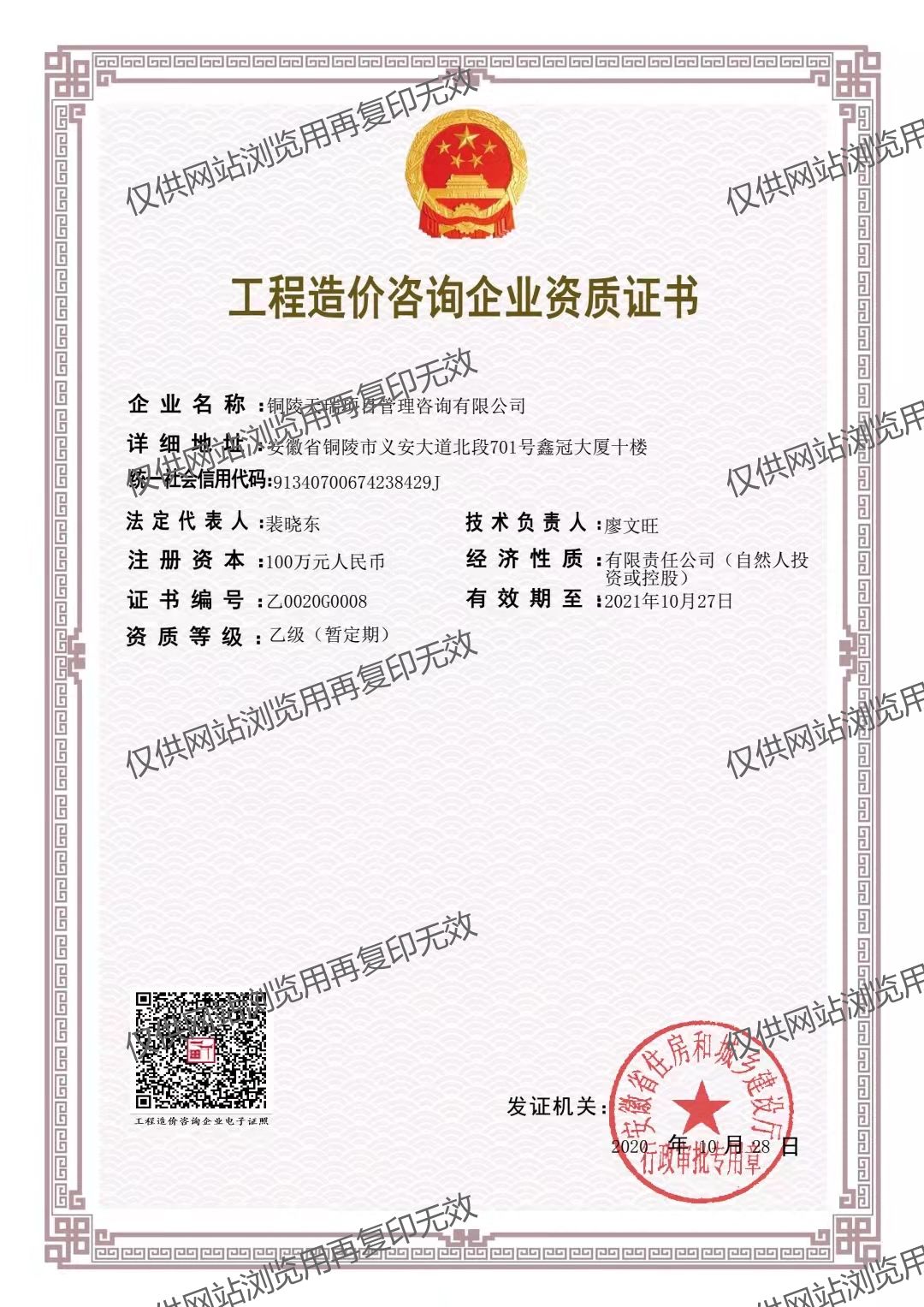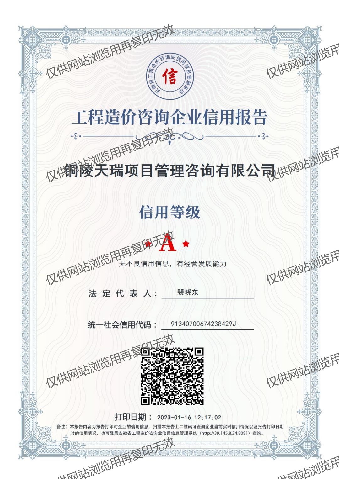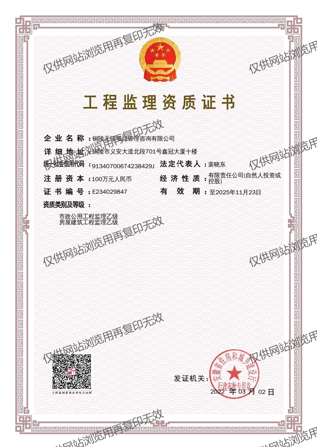 銅陵天瑞項(xiàng)目管理公司具有:工程監(jiān)理乙級資質(zhì)、工程造價乙級資質(zhì)、招標(biāo)代理及政府采購資質(zhì)(備案)、工程咨詢資質(zhì)(備案)等資質(zhì)。