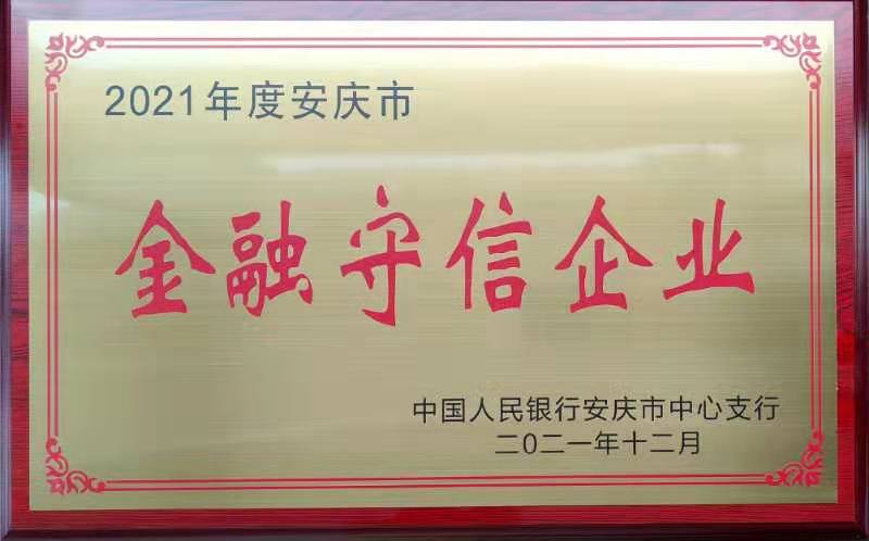 “金融守信企業(yè)”稱號系根據(jù)《安慶市金融守信企業(yè)評定實(shí)施辦法》,經(jīng)市中級人民法院、市住建委、稅務(wù)局、工商質(zhì)監(jiān)局、環(huán)保局、公管局等部門評議,并由安慶市銀行行長聯(lián)席會議評定授予。