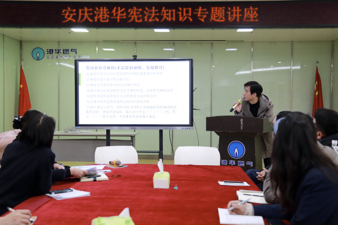 組織20余名員工代表開展憲法專題講座,以《中華人民共和國憲法》《勞動(dòng)法》《城鎮(zhèn)燃?xì)夤芾項(xiàng)l例》及誠信合規(guī)相關(guān)法律法規(guī)的解讀和案例詳解為主要內(nèi)容,進(jìn)行法律宣講。
