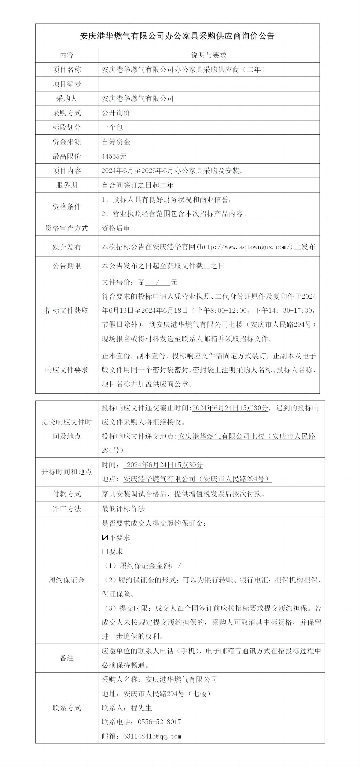 安慶港華燃?xì)庥邢薰巨k公家具采購(gòu)供應(yīng)商詢(xún)價(jià)公告