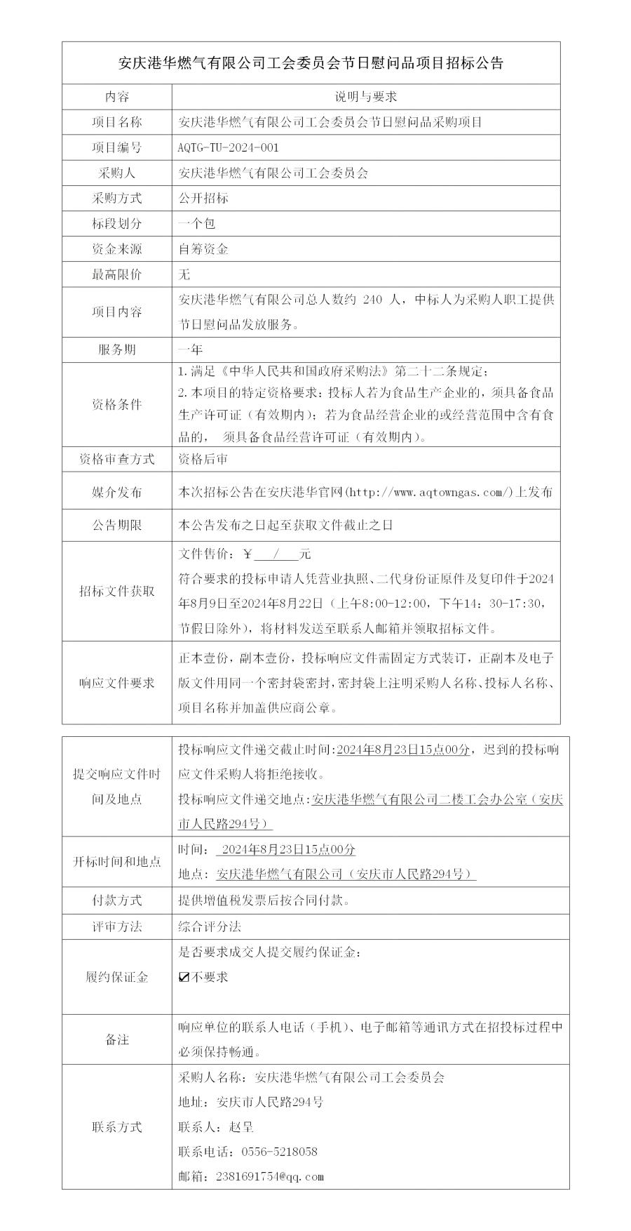 安慶港華燃?xì)庥邢薰竟瘑T會節(jié)日慰問品項(xiàng)目招標(biāo)公告