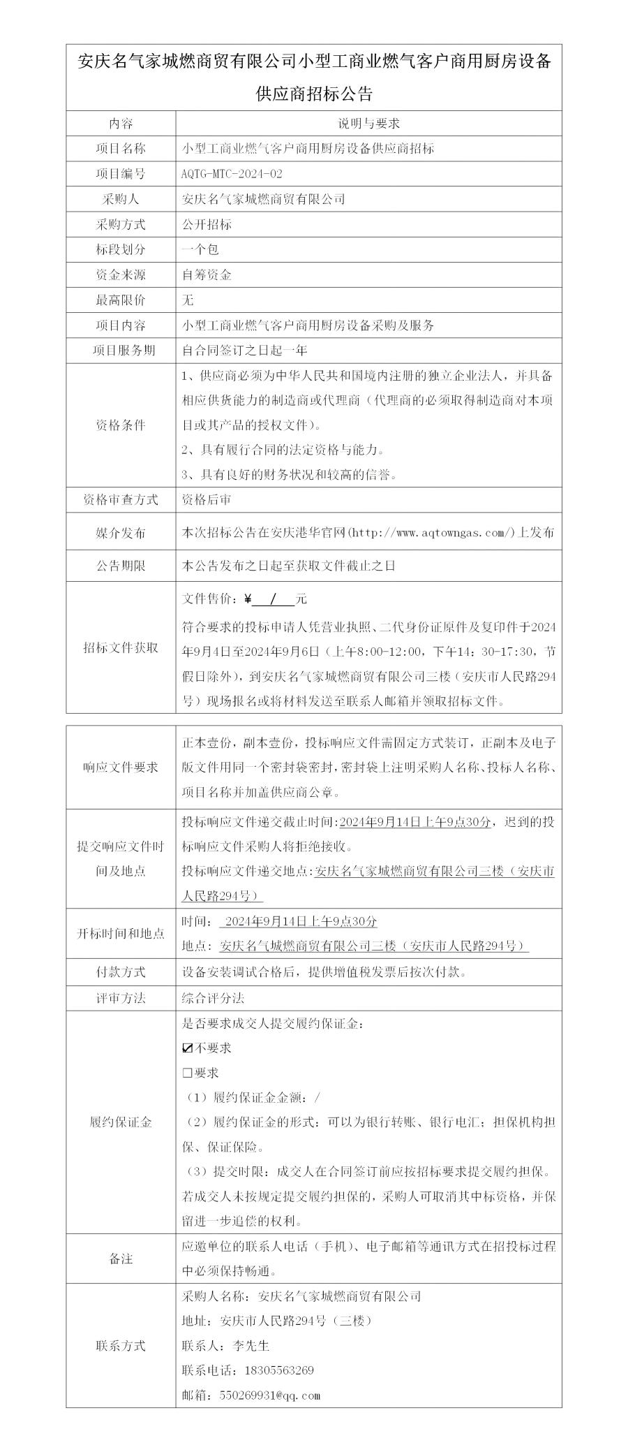 安慶名氣家城燃商貿有限公司小型工商業(yè)燃氣客戶商用廚房設備供應商招標公告
