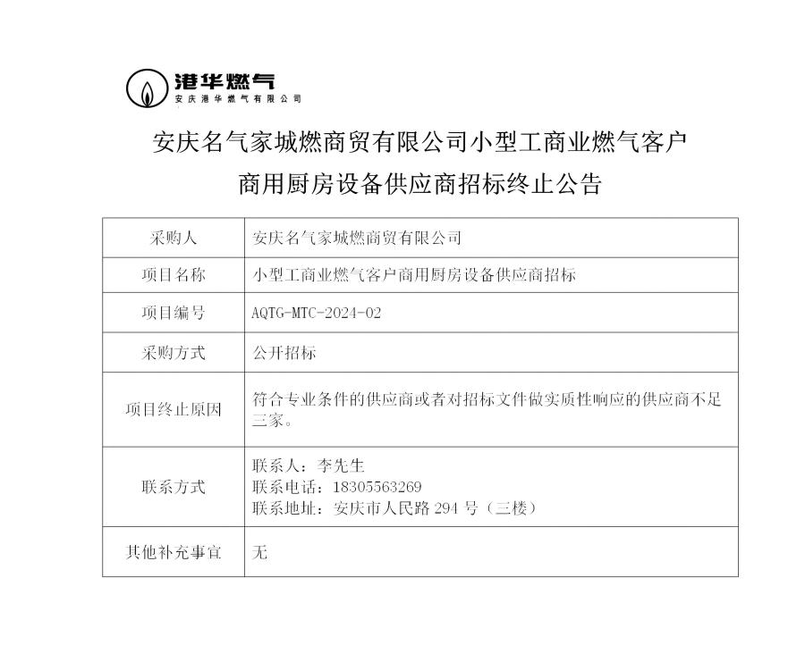 安慶名氣家城燃商貿有限公司小型工商業(yè)燃氣客戶商用廚房設備供應商招標終止公告