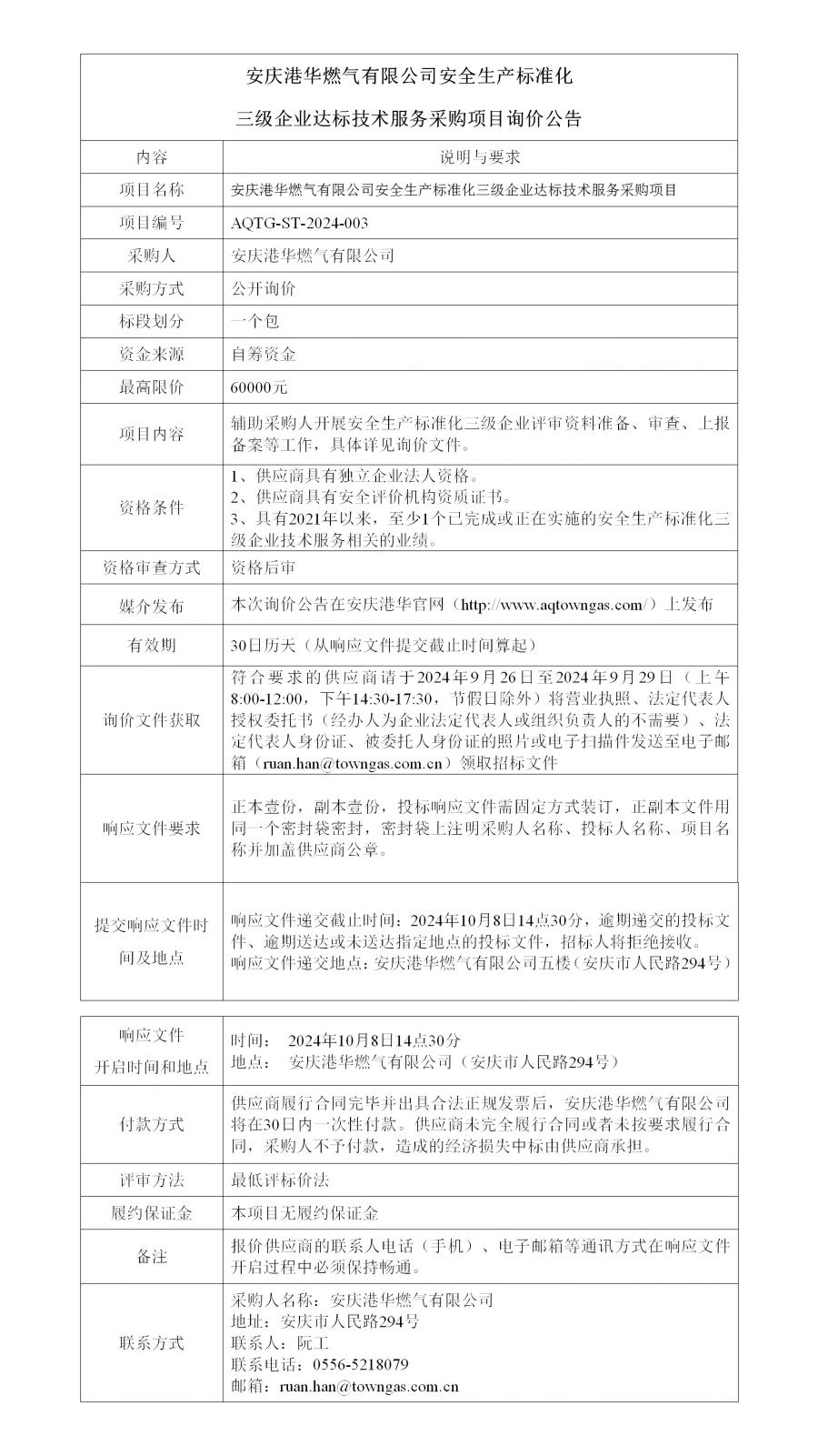 安慶港華燃氣有限公司安全生產標準化三級企業(yè)達標技術服務采購項目詢價公告