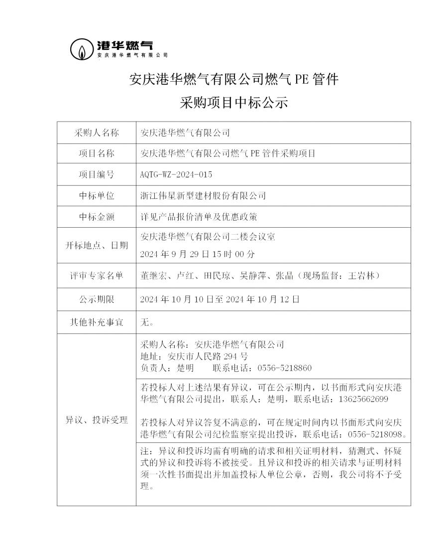 安慶港華燃?xì)庥邢薰救細(xì)釶E管件采購項(xiàng)目中標(biāo)公示