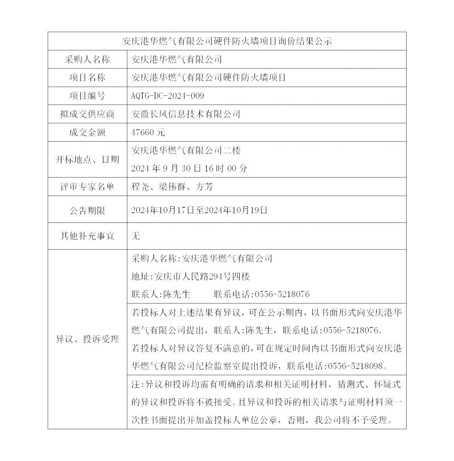 安慶港華燃氣有限公司硬件防火墻項目詢價結果公示
