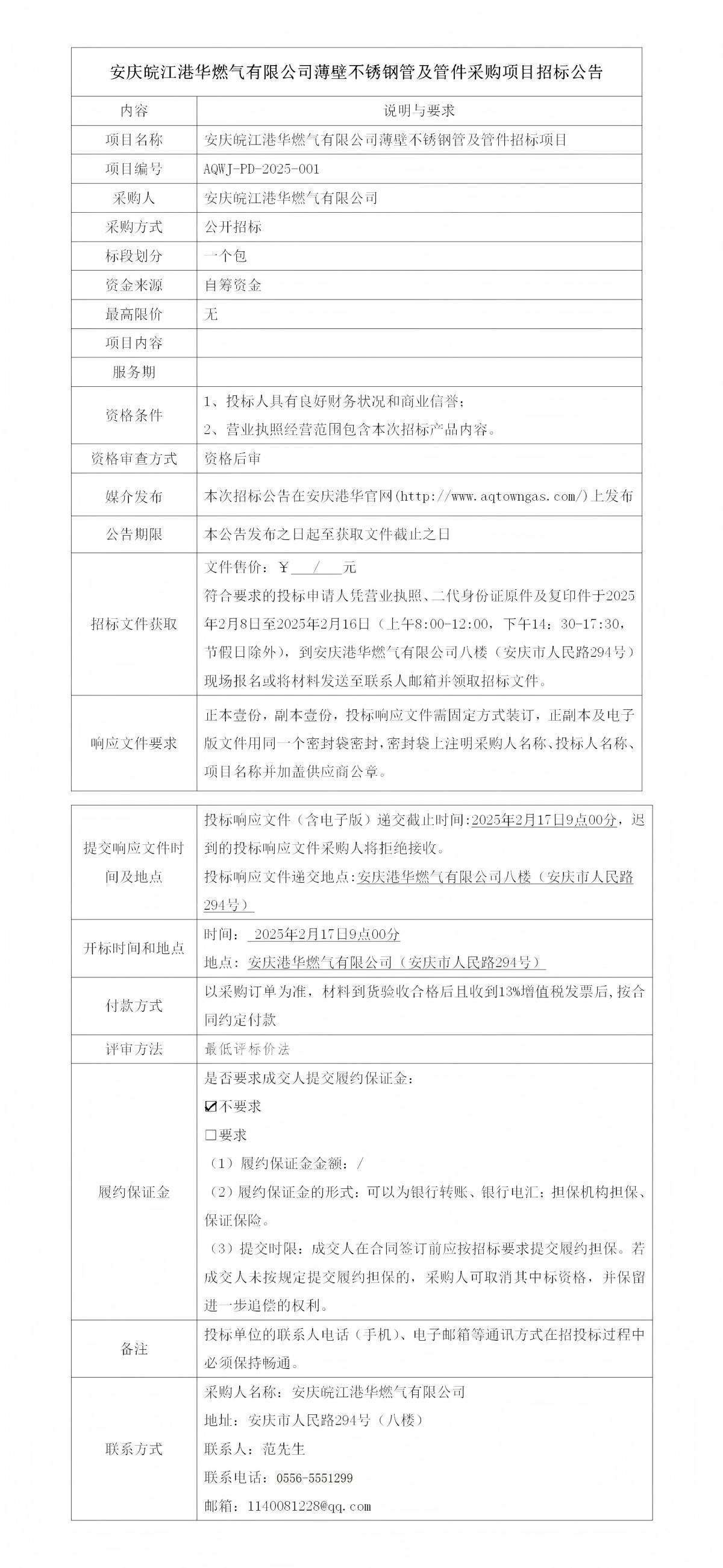 安慶皖江港華燃?xì)庥邢薰颈”诓讳P鋼管及管件采購項(xiàng)目招標(biāo)公告